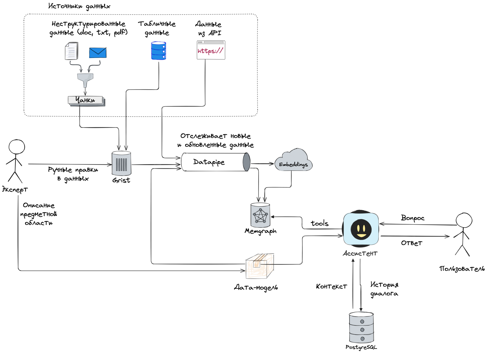 Мы явно задаём модель предметной области (анкеры, атрибуты, линки), подключаем структурированные источники и даём ассистенту набор инструментов — от векторного поиска до Cypher-запросов и API. В такой схеме LLM выступает не «хранилищем знаний», а интерфейсом для работы с базой.