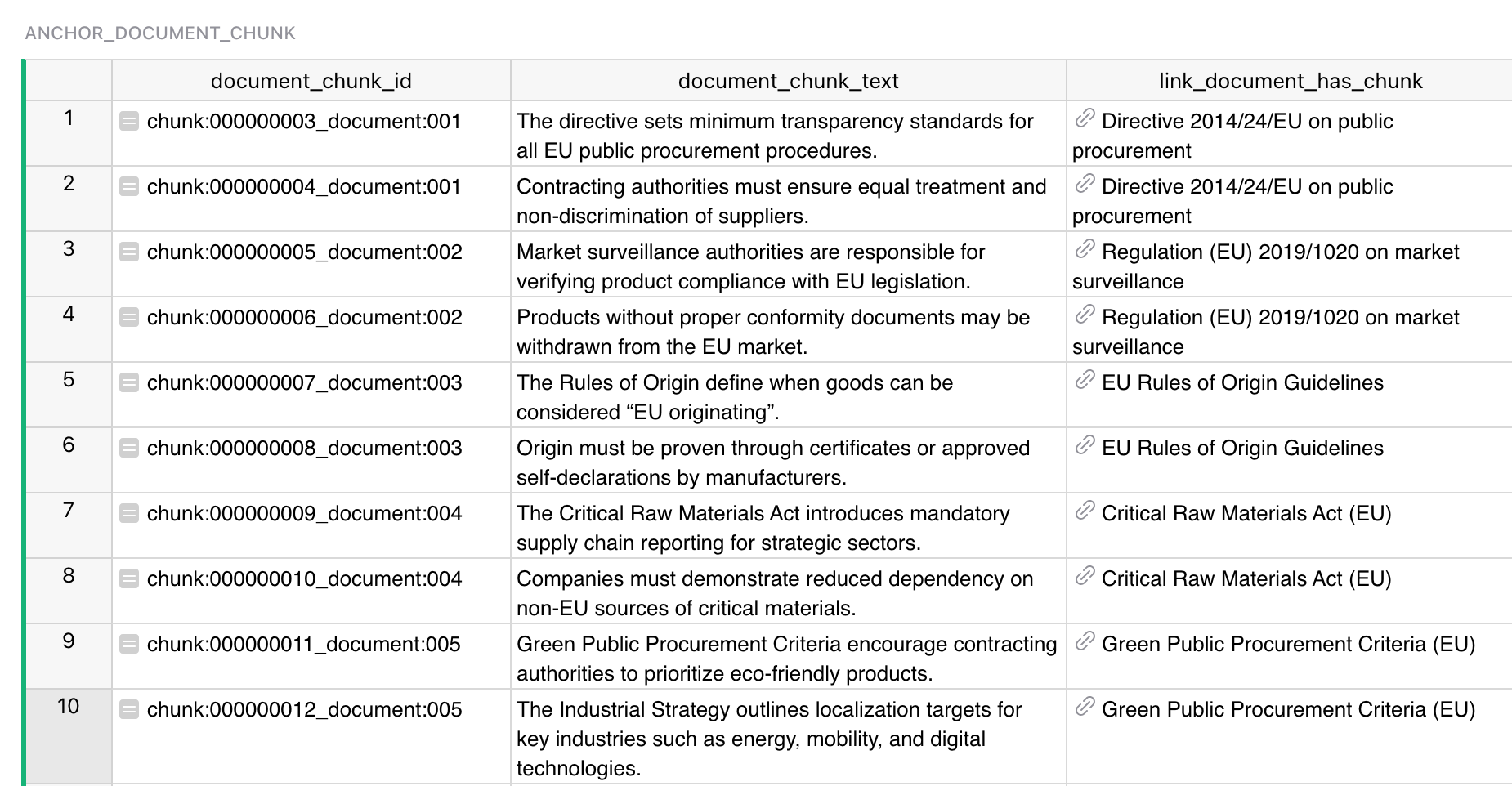 - Таблица соответствий (CN → документы) — дистиллированное экспертное знание: к каким CN-кодам какие документы применяются, с условиями. Эта логика извлекается по правилам из множества нормативных актов, но мы не перекладываем реконструкцию правил на LLM — готовим таблицу заранее и загружаем её как часть структуры.