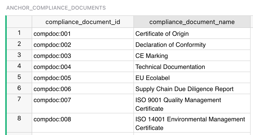 И таблица-связка между CN code и Compliance document (для конкретного товара по коду нужны конкретные документы). Эту связку мы реализуем отдельной link table для удобства.
