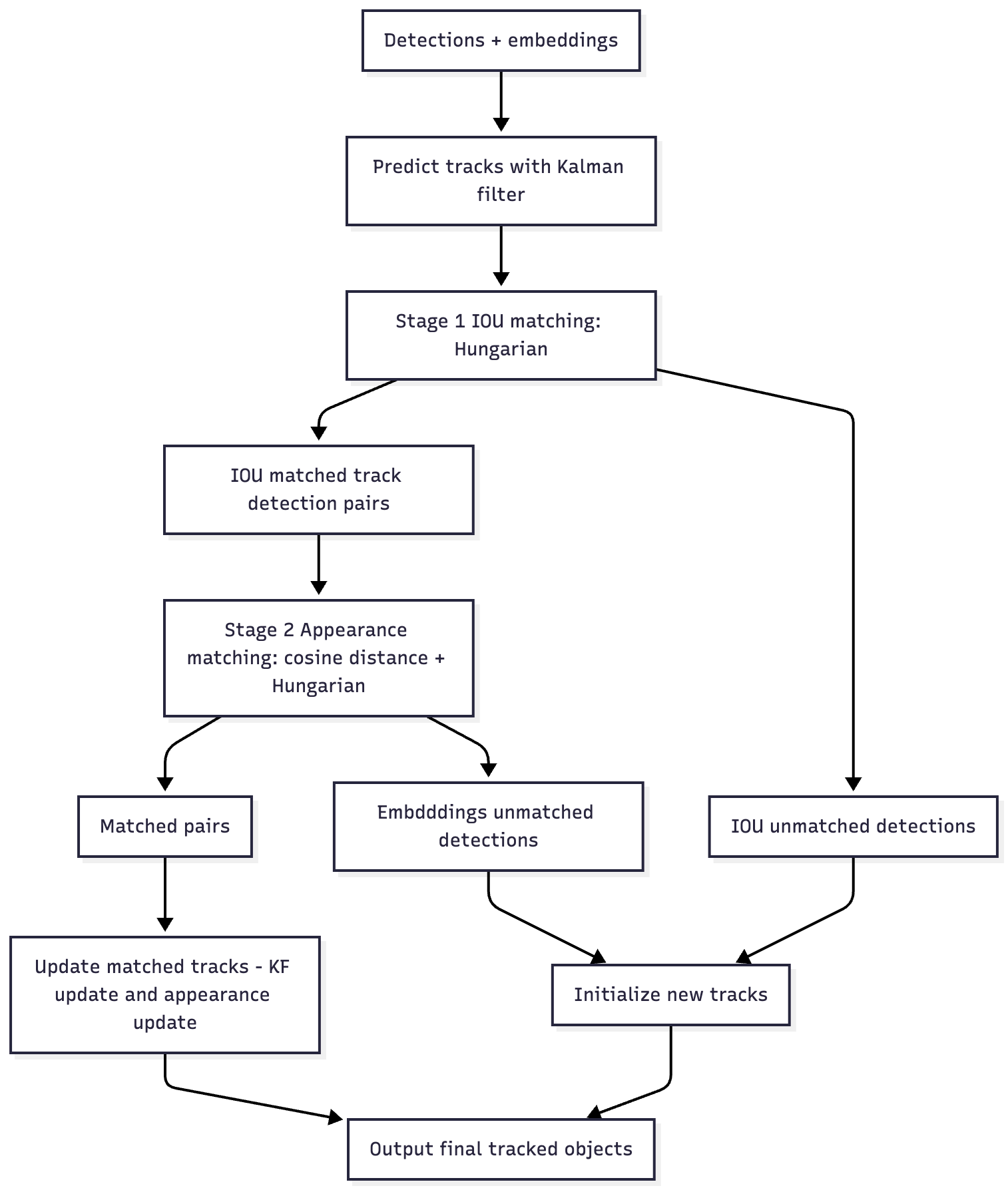 Оригинальный DeepSORT: сначала матчинг по эмбеддингам (убирая нереалистичные фильтром Калмана), а для тех, что не сматчились по эмбеддингам - матчинг по IoU.