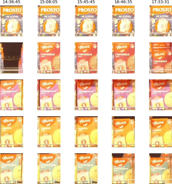 Столбец - одно фото с камеры, строка - один набор координат. Конкретно на этой камере товары со временем почти не меняются и выглядят почти идентично, так, что трекинг будет работать хорошо. Но так хорошо дела обстоят далеко не на всех камерах.